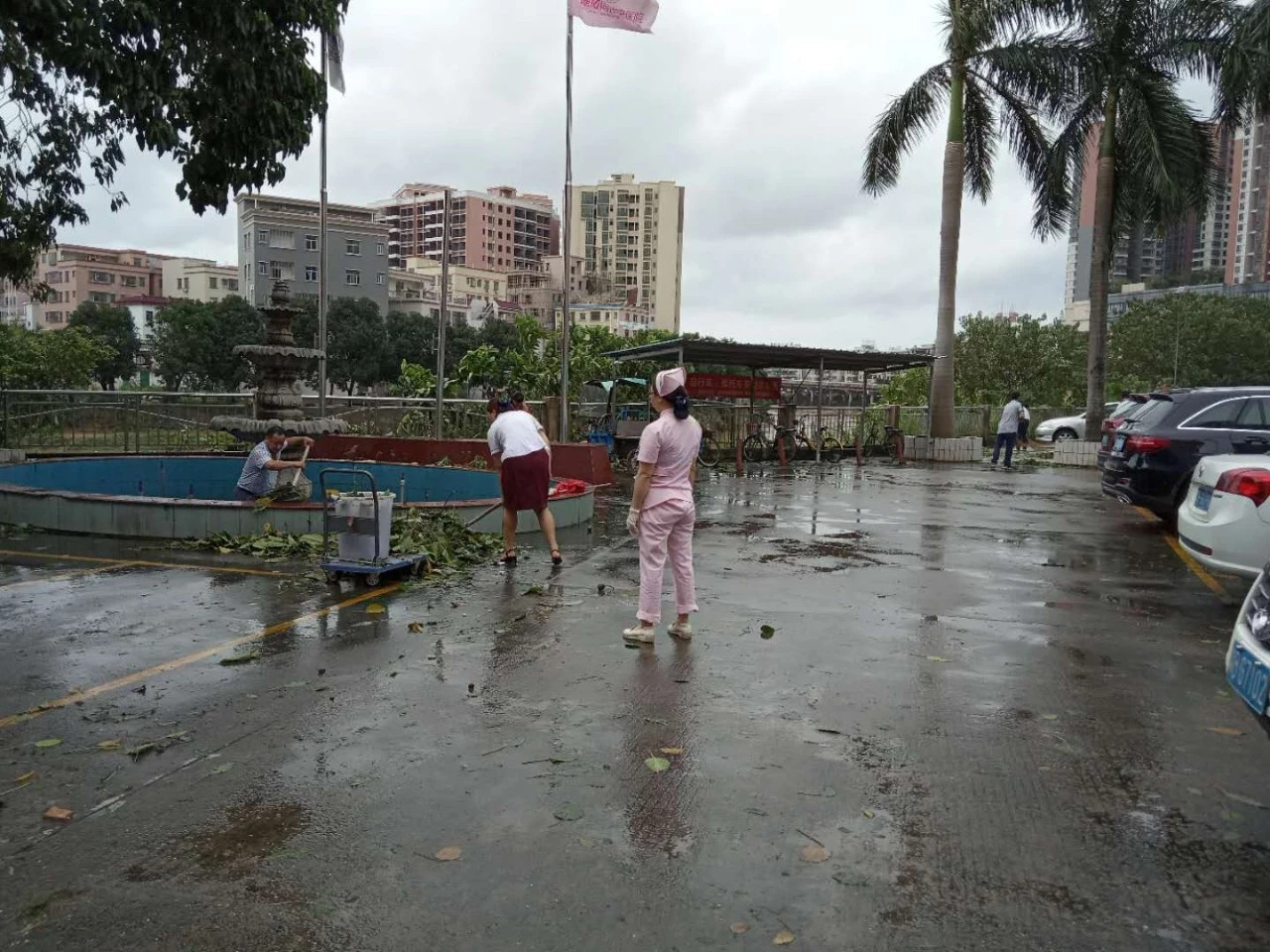 受到强台风“山竹”的影响,我院主要停车场与垃圾房后方部分树木被吹倒,散下来的枝叶严重影响医院环境。全院每个科室各派一人全面开展灾后复产工作。