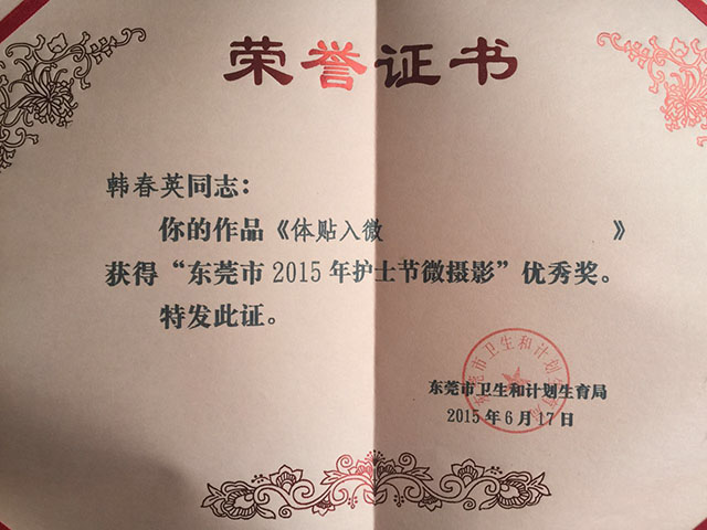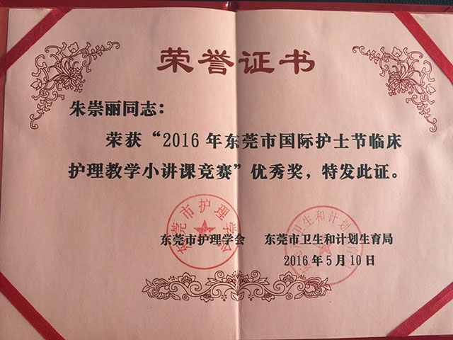 近年来,我院护理团队凭借其专业的医疗技术水平、优质的服务态度,先后荣获“东莞市先进护理集体”荣誉称号,并在东莞市各种竞赛中取得“东莞市2015年国际护士节临床护理教学小讲课竞赛”三等奖和“东莞市2015年护士节微摄影”先进奖等多项殊荣。