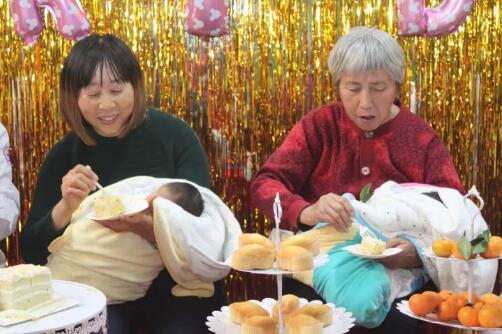 宝宝的奶奶代替宝宝吃下第一口生日蛋糕