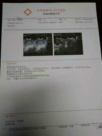 塘厦宝仁妇产医院第1026例求子报喜:患者,李女士,24岁。因未避未孕1+年,停经2+月就诊我院。患者平素月经周期2-6月,经期2-3天。诊断:1.原发不孕2.多囊卵巢综合症。故予以调经治疗的同时行输卵管造影检查提示:双侧输卵管通而不畅,伞端扩张扭曲。建议保守治疗2个月,若保守治疗后未能怀孕建议行宫腹腔镜手术治疗。经促排、监卵、指导同房等治后,2017年12月24日查B超提示宫内早孕,孕约5周。